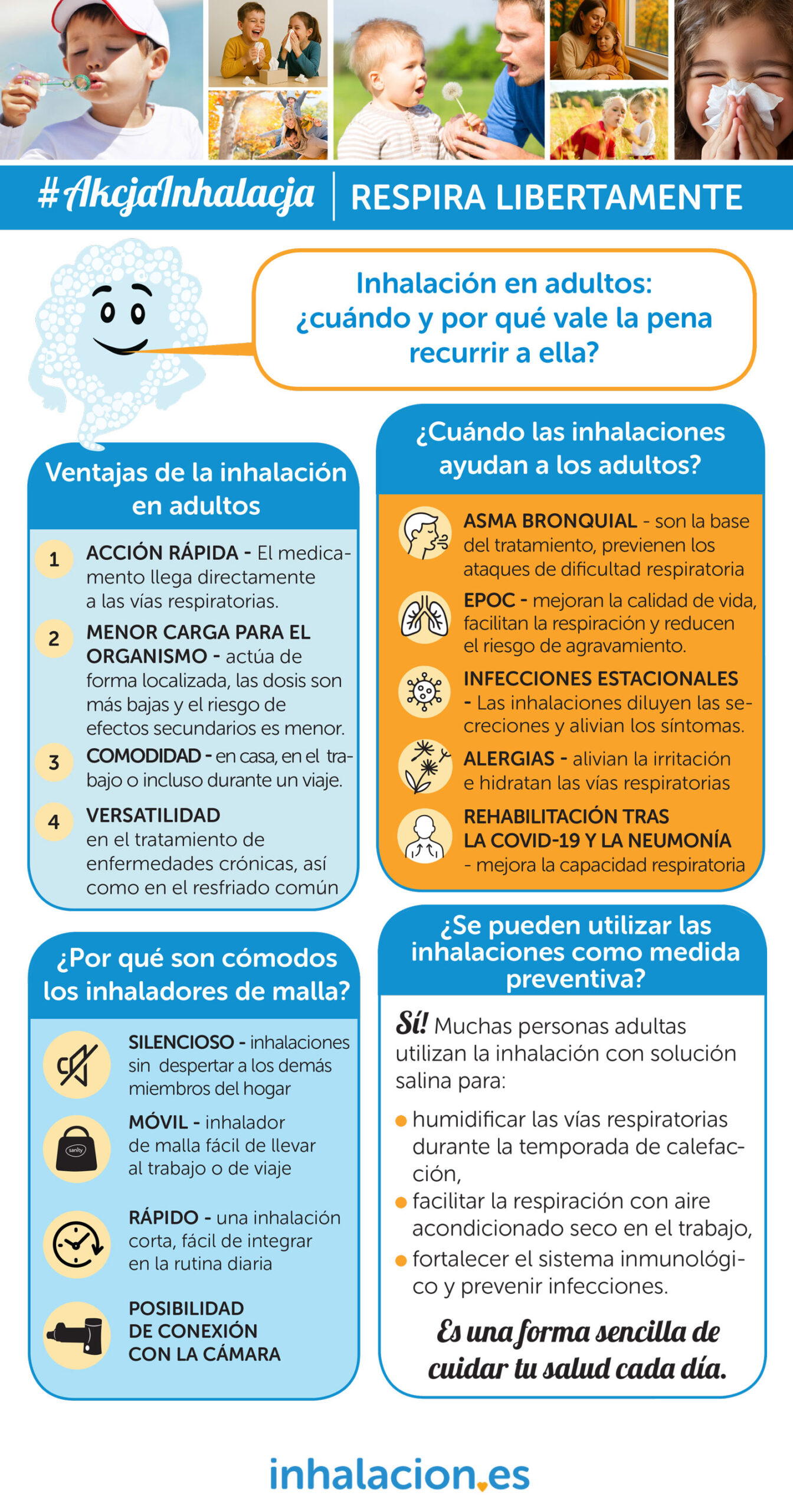 - Infecciones estacionales: tos, resfriado, bronquitis: las inhalaciones diluyen las secreciones y alivian los síntomas.