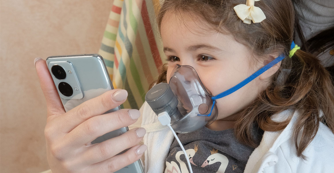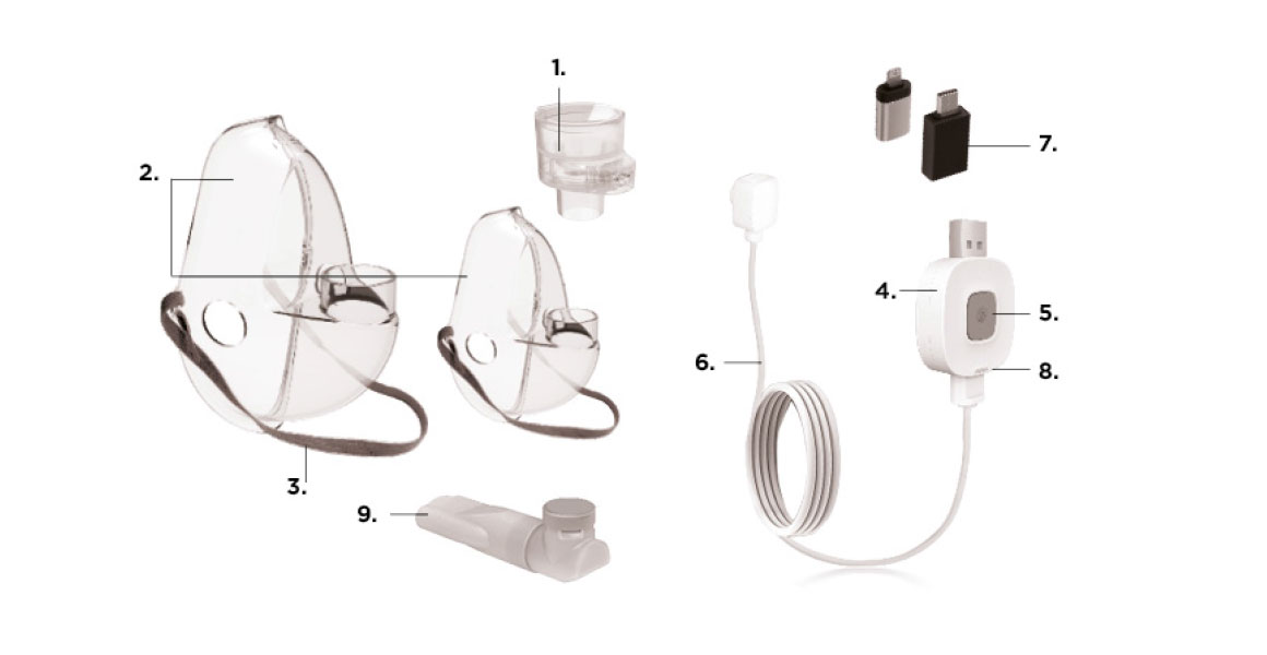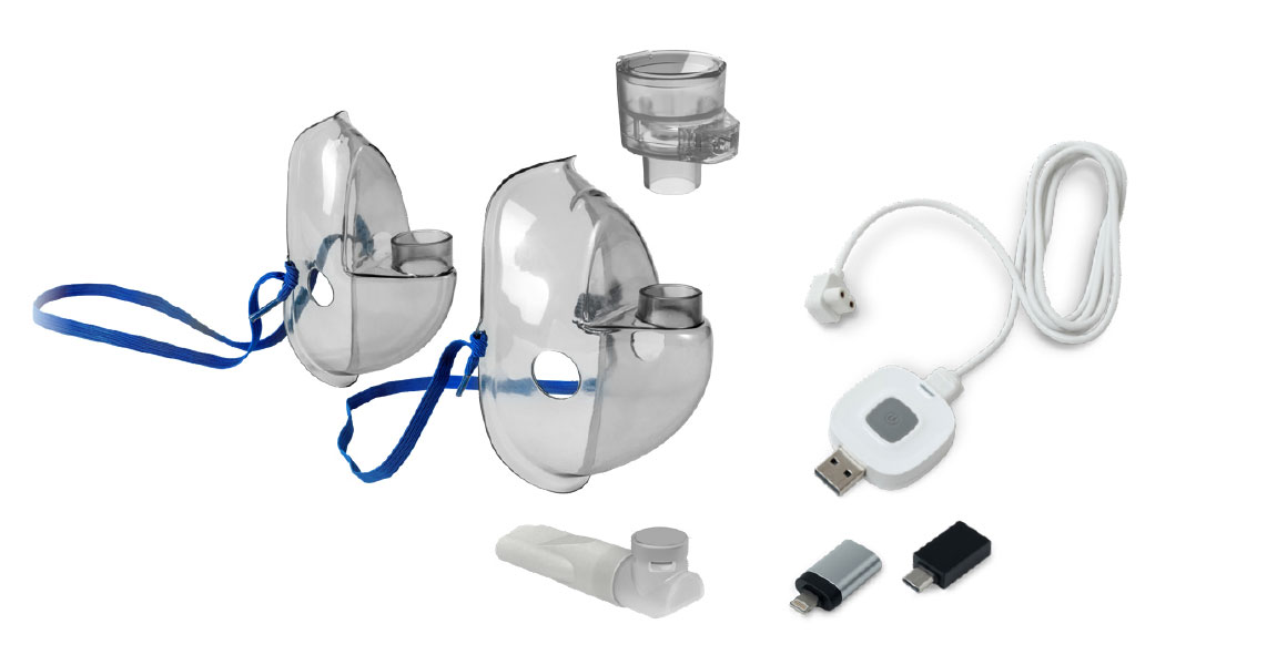 OnePro to wibrująca membrana MESH do podawania leków w nebulizacji, który może być zasilany z dowolnego urządzenia USB i składa się z komory lekowej, maski dla dorosłych i pediatrycznej, ustnika, kabla USB i adapterów do smartfonów.